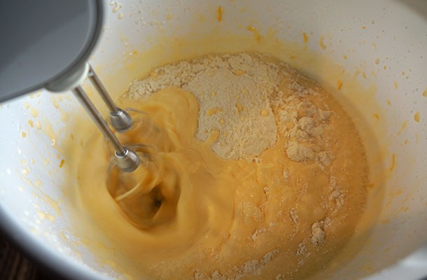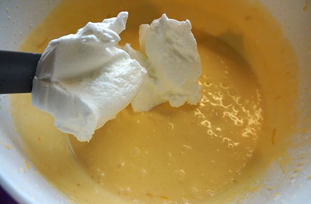 - 6. Σε ένα άλλο μπολ χτυπάμε τα ασπράδια σε μαρέγκα και την ενσωματώνουμε στο προηγούμενο μίγμα ανακατεύοντας απαλά.